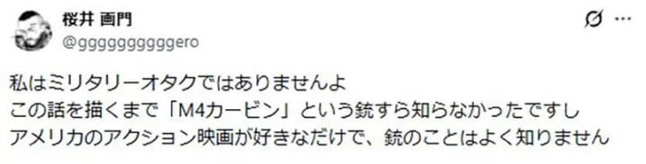 樱井画门本人直接出来否认:“我根本不是军武宅。在画这部作品之前,我甚至不知道什么是M4卡宾枪。”