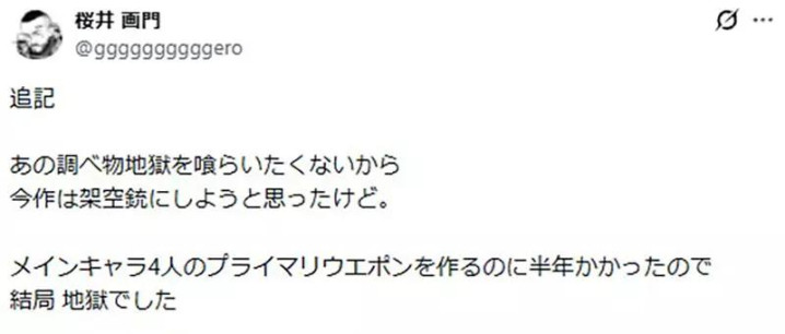 结果他又说“光是给主角团设计4把武器,就花了半年。”