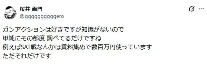 听起来很普通,但他后面补了一句:“为了画SAT(特殊部队)的战斗,我花了上百万日元收集资料。”