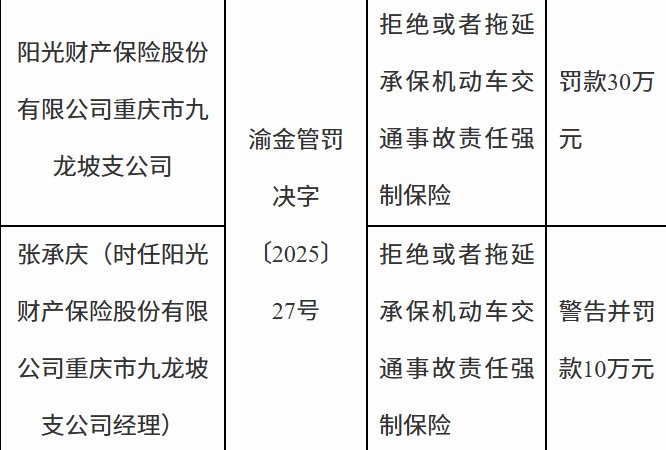 12月12日,国家金融监督管理总局重庆监管局行政处罚信息公开表显示锦鲤配资,阳光财产保险股份有限公司重庆市九龙坡支公司因拒绝或者拖延承保机动车交通事故责任强制保险被罚款30万元;张某庆被警告并罚款10万元。